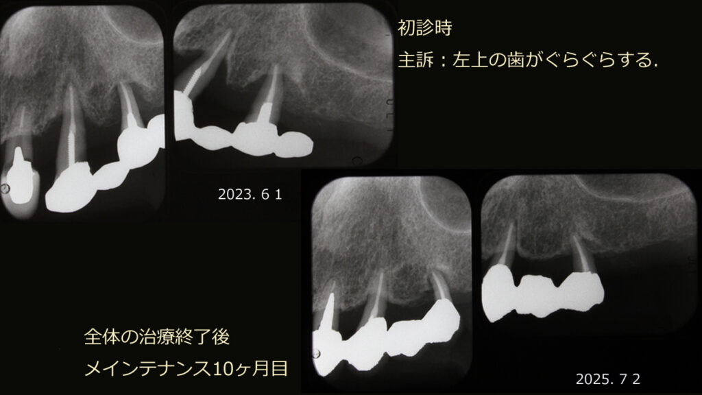 主訴は左上の歯がグラグラする。入れ歯は都合悪いと周りの人から言われるので歯を残せるものなら残して欲しい。というものでした。咬合性外傷を伴う重度の歯周炎ですが、歯周基本治療のみで対応して補綴をしました。まだメインテナンスに入って10ヶ月経過時の写真ですが、組織がかなり安定してきています。実際はこれからの継続したモチベーションと管理が重要なのですが。